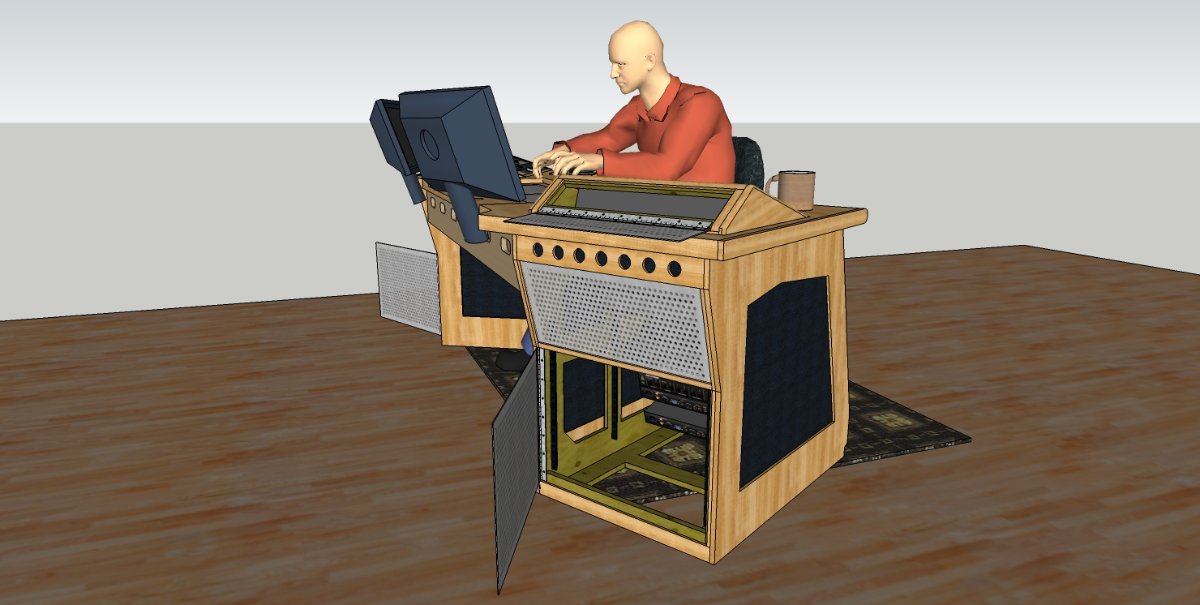 It's an acoustically low-profile desk for control rooms, that tries to present as small of an acoustic obstacle as possible, while also being compact and versatile, as well as relatively easy to build for the DIY home studio builder. It has plenty of rack gear space, most of which is easily accessible from the mix position: 12 RU on the sloped upper modules (6 on each side), 28 RU on the front faces of the legs (14 on each side), and another 18 RU around the back (9 on each side). Total rack unit space: 58 RU (and could be 62 at a pinch). That's about one and a half full size equipment racks: more than enough for the majority of studios!