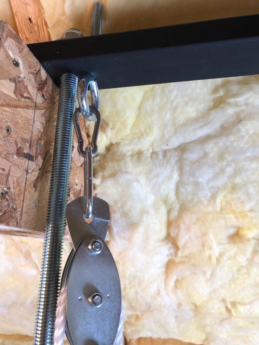 Here you can see where I used a custom winching system to help lift the box in place. Due to the COVID pandemic I had to improvise before having people over to help was not possible, so I ordered 4x rope & pulley winches from amazon as well as a series of additional pulleys and hardware to make it work. Overall the lift went really well!