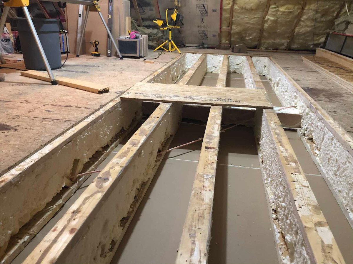 Here's the 2nd section of the floor where I had to rip out the existing sub-floor. I tell ya, must have filled around 35-40 garbage bags of spray foam insulation for the two sections combined. Doing this section was very similar to the first section so since I learned a few tricks from the previous section I was able to save a bit of time doing this one. Only difference this time is that I had to open it up a little wider to span across 3 floor joists versus 2 for the previous section. This section of the floor will support two separate inner leaf walls. 1 for the Control Room and the other for the Live Room. They will be approx. 14 inches apart.
