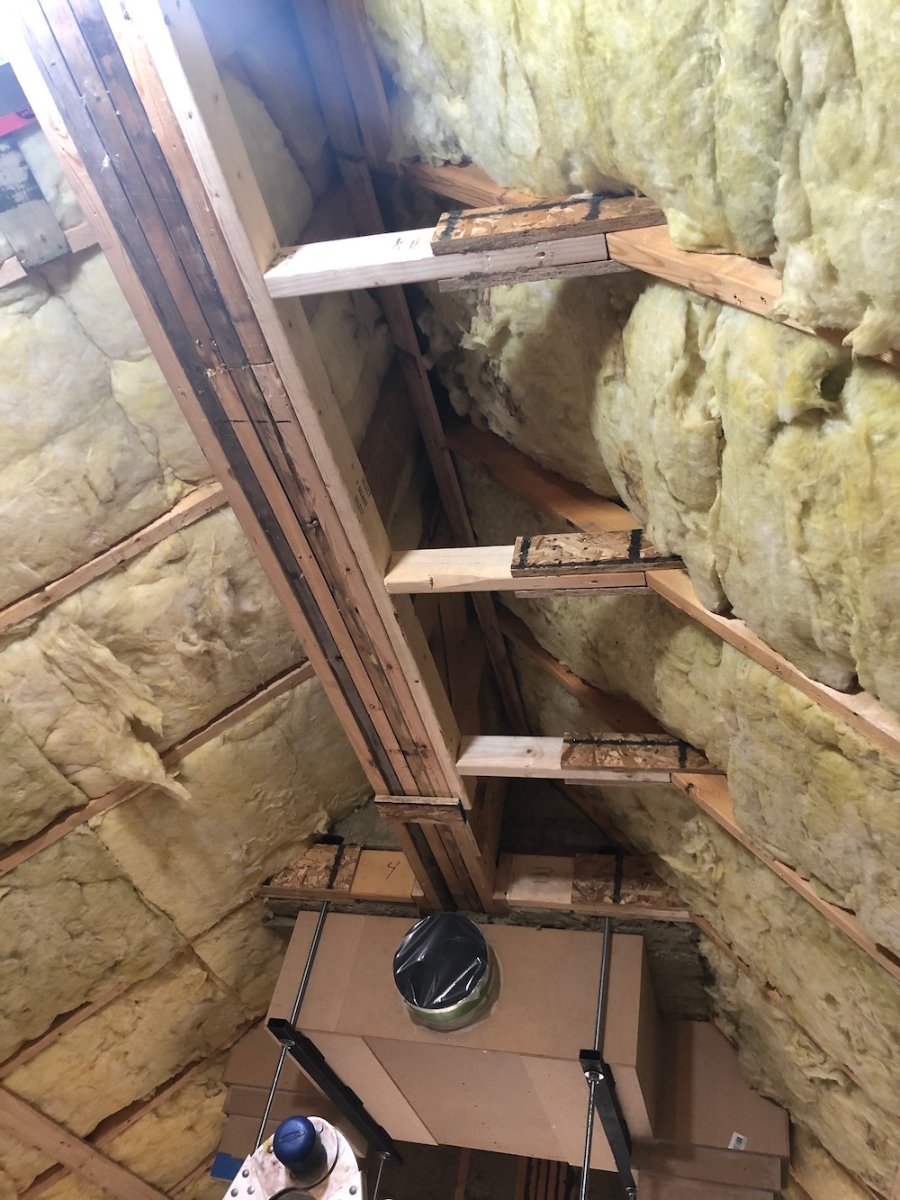 Now that the box is sitting at the top, I tried my best to completely surround the box with insulation. I had to fill every little nook and cranny and make sure there's no air gaps anywhere. Lots more insulation will need to be done later on but for now I'm making sure I address all of these hard to reach places because once the ceilings are framed I will not be able to get to those places so it all had to be done now.