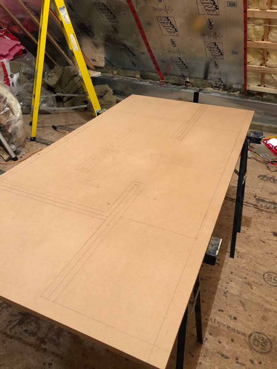 If you look at the 3D model sample of the studio in the previous post you'll see these big boxes sitting on top of my room ceilings. Those are the silencer boxes and you can also see, they take up a lot of room. They're HUGE!! To give you an idea, used almost 2x 4ft x 8ft sheets of 1 inch thick MDF to build each of these boxes and each sheet of MDF weighs roughly 120lbs. Add glue, sealant, duct liner, fasteners and I estimate each box to weigh around 250lbs if not more.