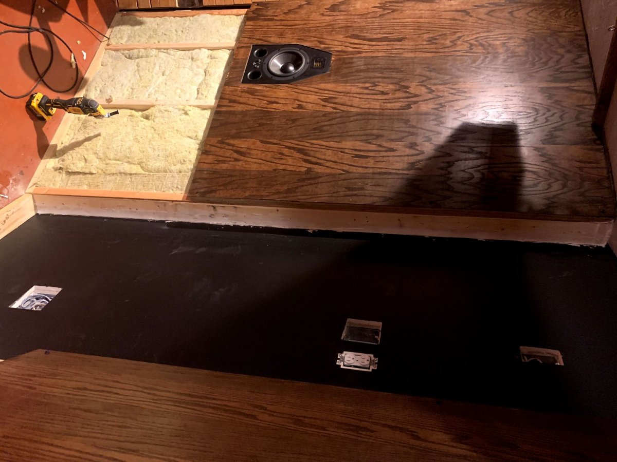 I was reviewing the soffit build, and noted that I still have a gap between the front wall and front edge of the baffle. I plan on filling this with wood and caulk to seal, but was waiting to see if I needed a hard or soft surface between the baffles (black wall area). I mention this, because I am now wondering if this is a source for some of my comb filtering? It seems odd, since I would expect that to only effect lower frequencies, but... I don't know. It seems odd that this would cause the problem, when I am also going to cut a speaker vent into the top of the baffle. I will try to get them properly sealed, as well as the door installed today and tomorrow and re-test.