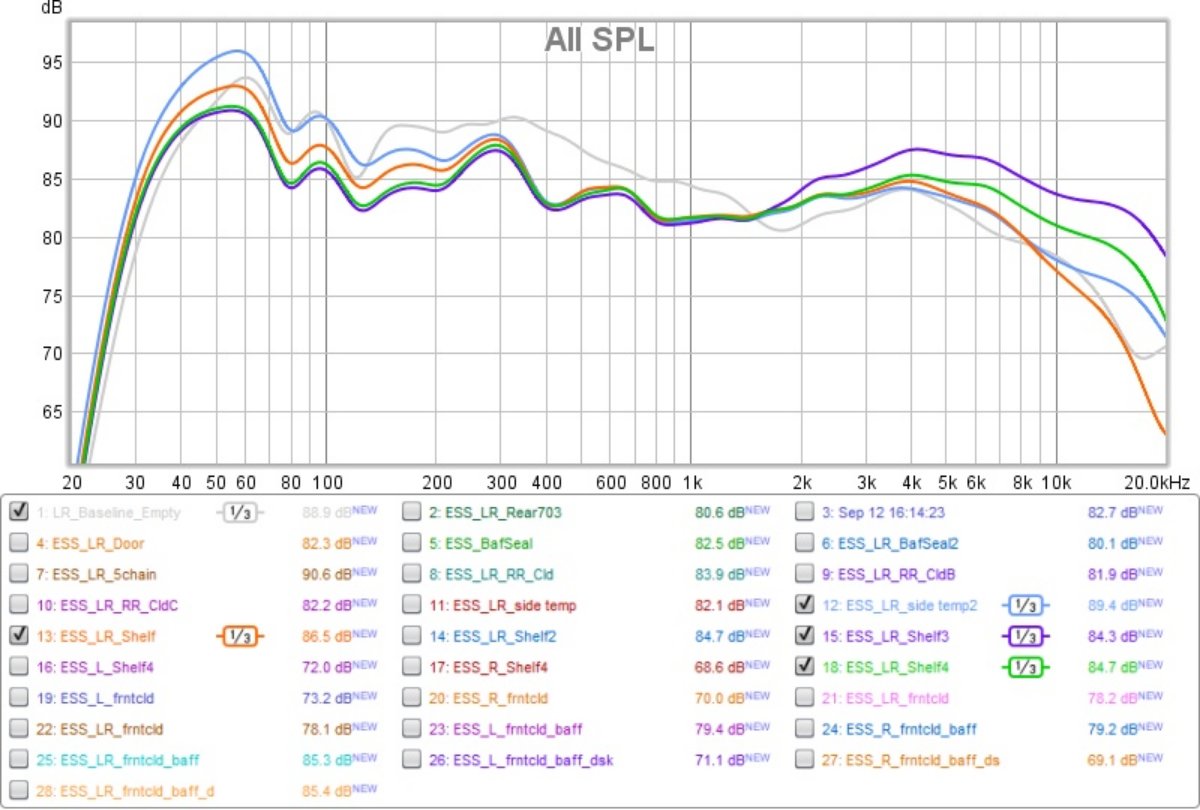 measurement mic, but I ordered a new presonus PRM1. You will see the first couple measurements with the behringer, then re-ran the tests with the PRM1. The baseline tests were only done with the behringer mic, I didn't get the PRM1 in time for those. When comparing the two, they line up fairly well, so I don't believe that will impact the comparison of testing, I think mic placement is more sensitive at this point than the difference between the two mics. (Again, you can see the tests for both mics in the MDAT file.)