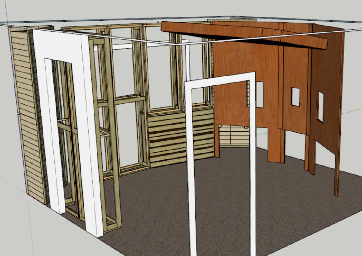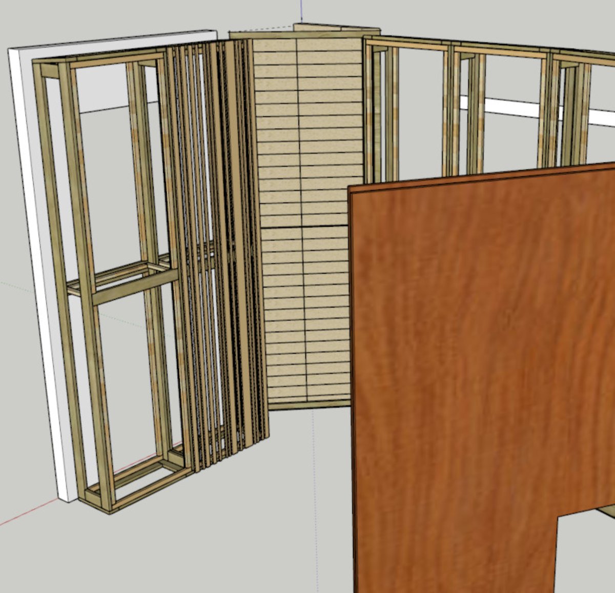 The back wall, if I've got the right idea, is pretty straight forward. Bass attack. Using Safe N Sound and AMCalc it seems like 3 inches of SnS, 3" air, 3" SnS, and 3" air gives me the best low end performance. So that's what's in the drawing.