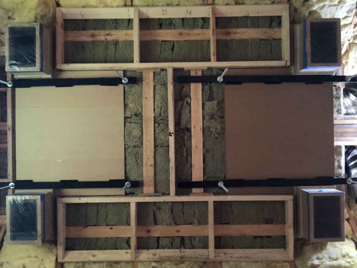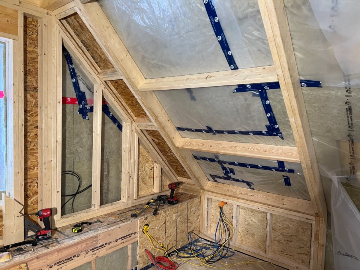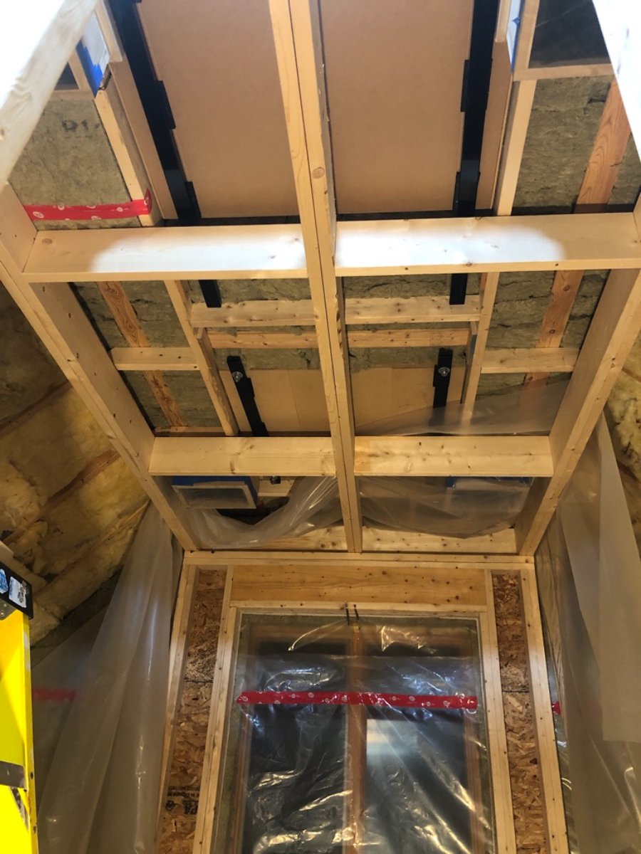 And here's some pictures of the framing/assembly along with other insulation and vapour barrier installation. You can see the ceiling joists that will be resting on top of the front and back walls. I'm making sure there's a good gap between the ceiling assembly and the baffle box assemblies above.