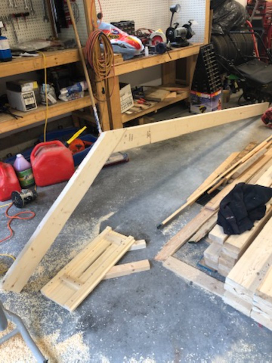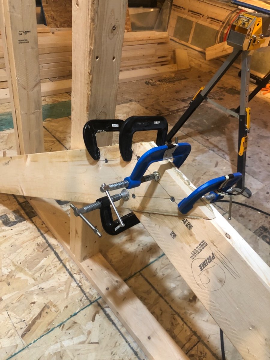 Next up was building the custom lumber trusses to accomodate for the sloped ceiling. Because of the short span I ended up being able to use 2x6 lumber and build my own. As you'll see in the pics below, I ended up using an 45 deg angled overlap joint. I needed to make 12 trusses total but ended up making a few extras just in case haha.