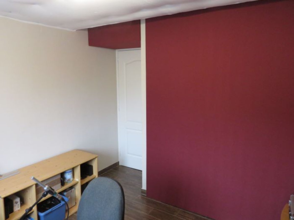 As you can see, I made 60cm deep hangers panels on the back wall (thank you Stuart for helping with that ;) ), 60cm deep superchunk bass trap above the door, and I have filled the ceiling with 20cm deep glasswool with a density of 17kg/m3 and an air flow resistivity of 7kPa.s/m². I have covered it with polyester batt in order to avoid fibers from falling of the ceiling.