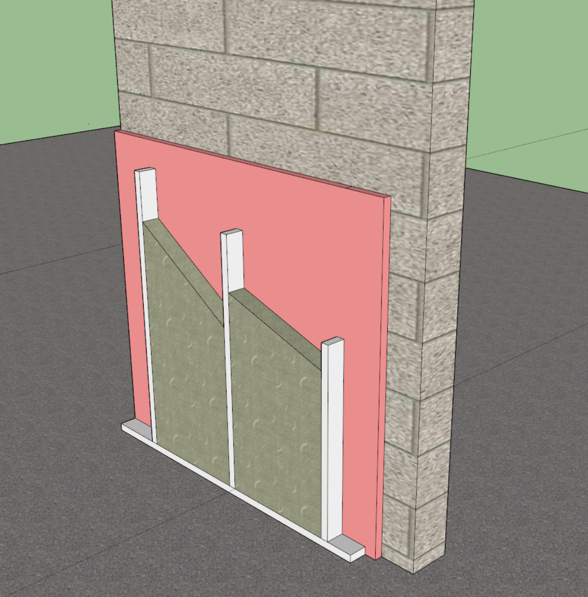 - "inside-out" walls on block walls, with air gap (comments on this? Should I add loose pink stuff?)