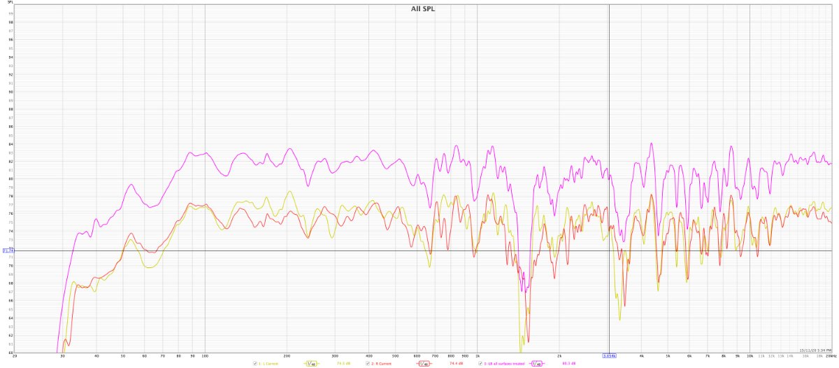 As you can see in the REW measurements there is an substantial improvement compared to the non treated room where everything is more smoothed out. From 20hz to 500hz there are still dips here and there but only 3db difference from 80db excluding 300hz area. Huge dip at 800hz and massive dip at 10-12khz, The room definitely sounds much better now compared to prior of treatment, the low end is much tighter, I’ve also noticed a very strong resonance in the high freq when I’m inside the room I assume it is the untreated ceilings.