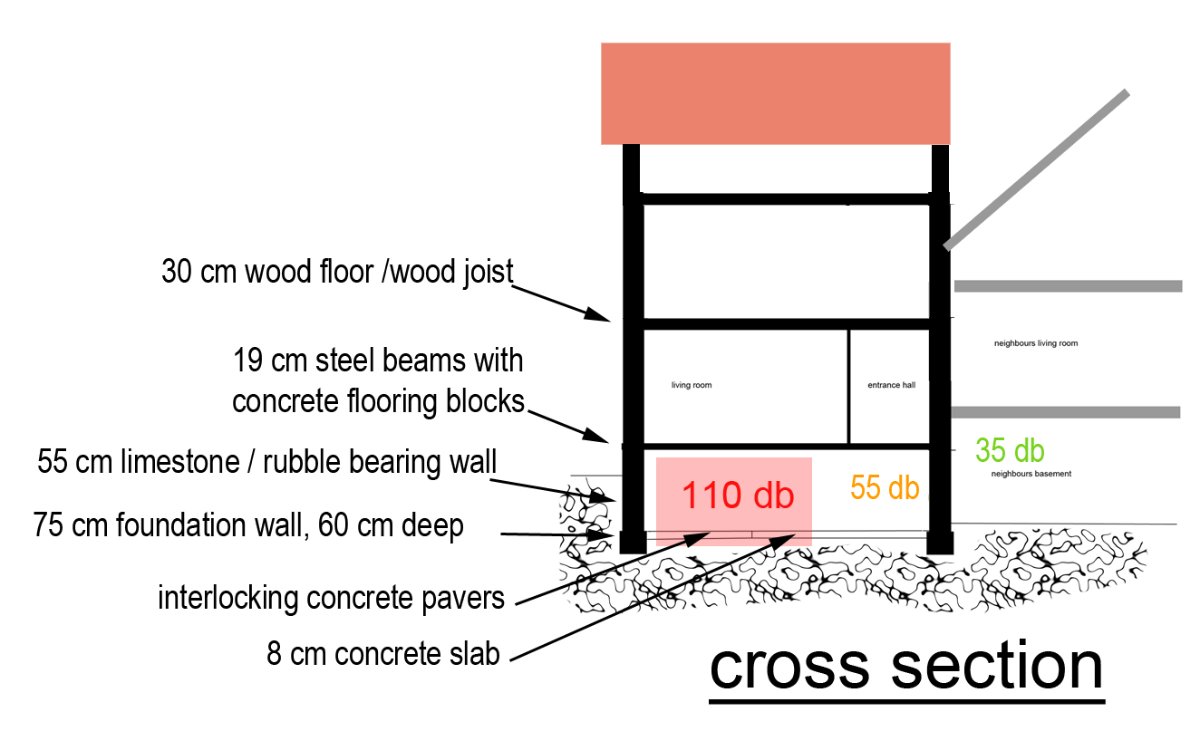The house is located in a houses neighboorhood with two streets (level of noise outside in daytime : 50db). The basement walls are underground/below grade with the fourth wall (at right)being common with my neighbours' basement. The environment sound level in my basement without noise (washing machine, etc,...) is around 30-35db (measured by iphone app...). With the washing machine on, it rises to 55db. The sound level in the neighbour's house is approximative because I won't be able to do measurements in... because of bad relationship with my neighbours...