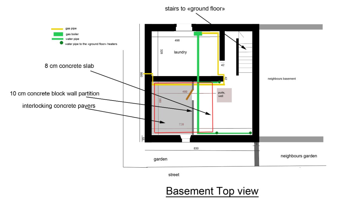 _ the ducting and the pipes that go to the ground floor through the basement's ceiling. The gas pipe and the heating water pipe paths are quite weird and need to be moved away. They go through the middle wall by 2 holes. This should be useful for the HVAC system and the electrical installation.