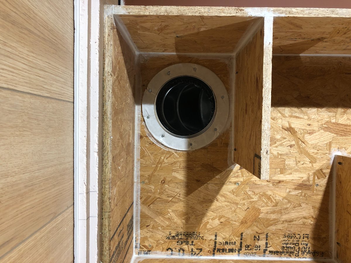 I caulked around the perimeter of the boxes, as well as the back of the box before I pushed it up against the wall, and screwed it in. Then I put added duct connectors to the two openings on each box, and added the top two layers of drywall. The next couple of days I'll be putting the side layers on, putting in the duct liner, and closing the boxes up.