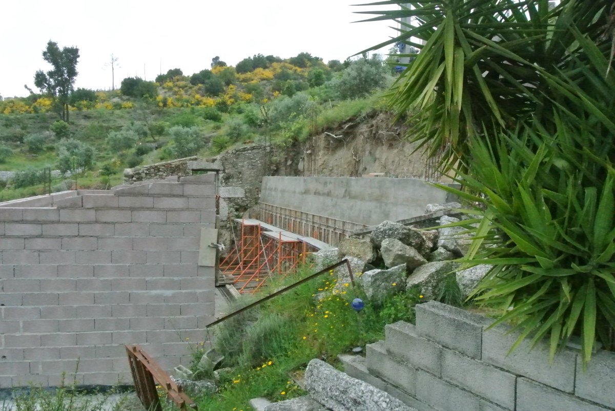 More progress on the retaining wall. The first pour is 3m. Then more shuttering and the last 2m after that. Then they will build a wall to the very top, which is around 7m. Paul said today the roof is 4.5m. I thought it was 5. They are still short about 6 metal shutters for make the complete wall in steel but Paul is pretty sure they will get them this week. No sign of the blocks yet. It is slow at the moment as there is so much steel to tie for the wall.