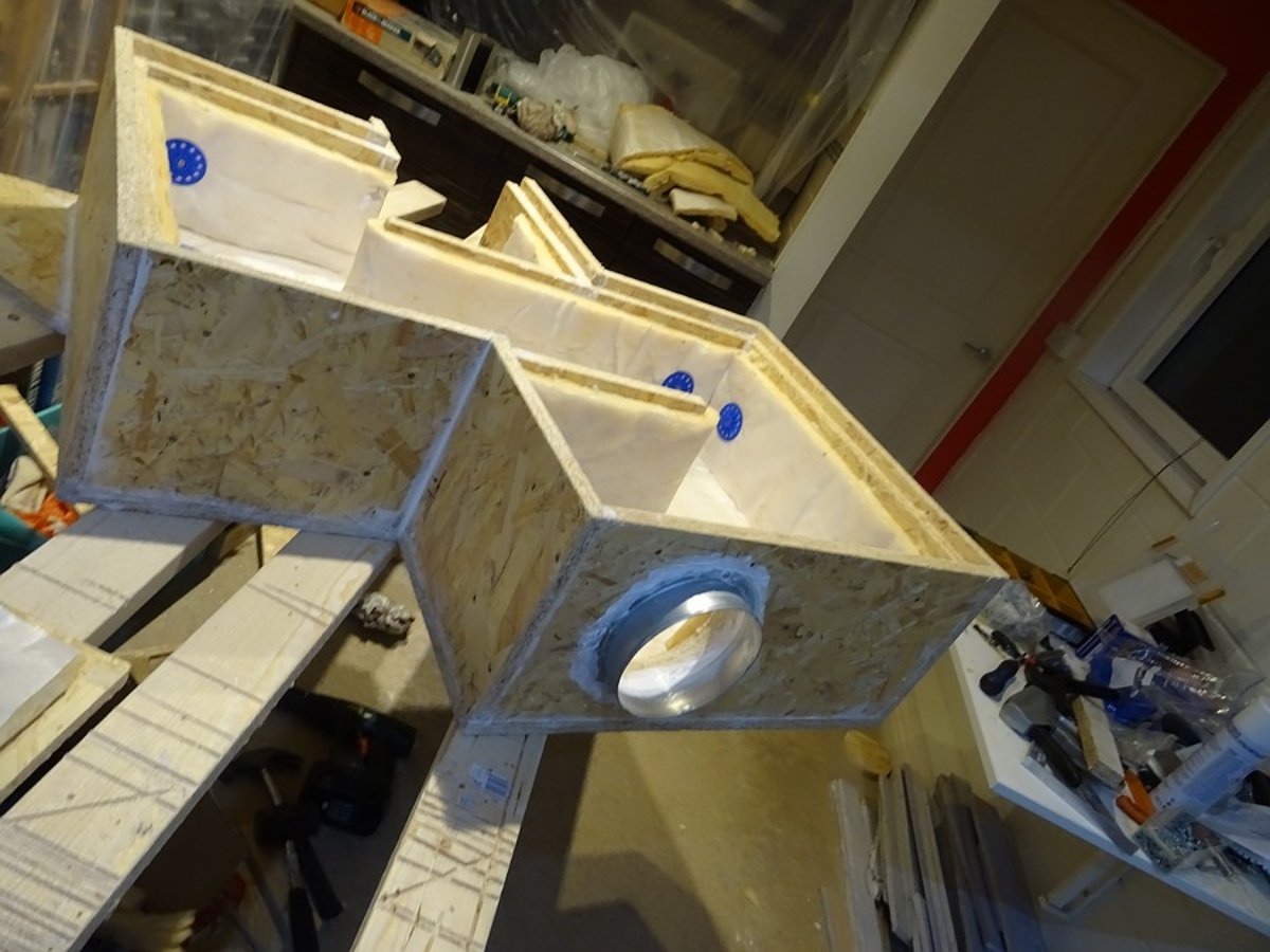 Spent the morning crawling about the roof eaves verifying the planned duct runs were realistic. Decided to go for a longer route of flex duct with very gradual turns rather than a shorter route with sharp turns. Did some tidying up in there, and used the circular saw to trim back the tongue and groove floor around the front knee walls to allow for a double layer of OSB + plasterboard. Previously there was just plasterboard. Also did several other small but necessary jobs preparing to fit the silencer.