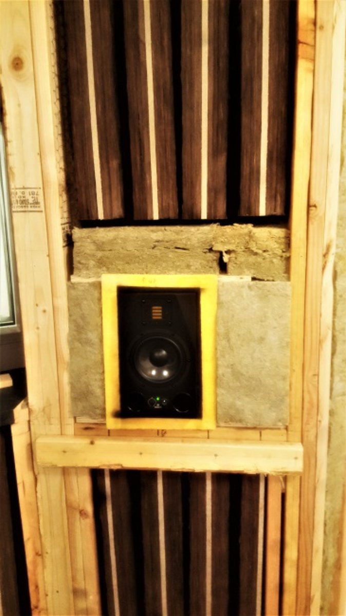 I had a tweeter go out on one of my Roland DS-90A speakers at this point. It was a good thing too, since even though I’m kind-of fond of these speakers, I learned that you can no longer get replacement parts and many people are looking for the tweeters out there! After all, these are 23 years old. I bought ADAM AX7 speakers and fortunately, I didn’t have to do much altering to the soffits nor the suspension assembly. Roxul insulation was stuffed on the sides of the speakers and a sort-of “gasket” was made out of a piece of 1 ½” OC-703 to seal around the space between the incoming baffle boards and the monitor speakers.
