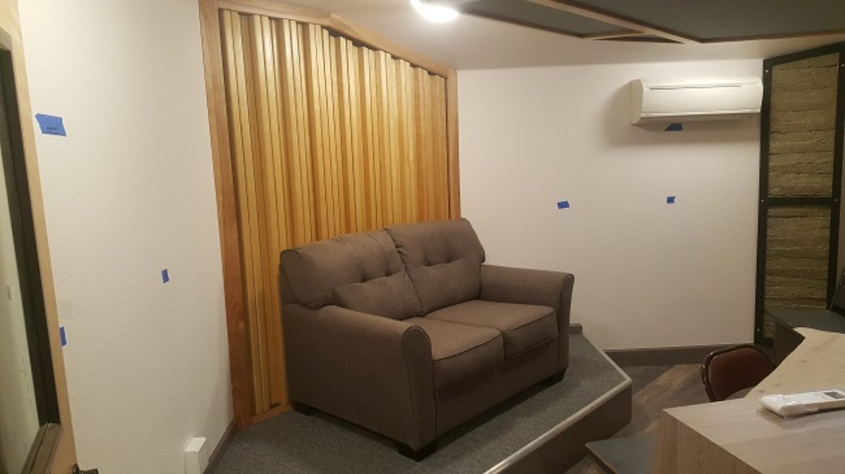 We built a 10” high pedestal in back of the control room to put the rear loveseat couch on so the listeners won’t be staring at the shoulder blades of the sound engineer directly in front of them. We framed it in and lined it with plastic sheeting, filled with old concrete chunks, cinder block pieces and finally sand, level with the top to fill the cavity. Finished photos visible later on...