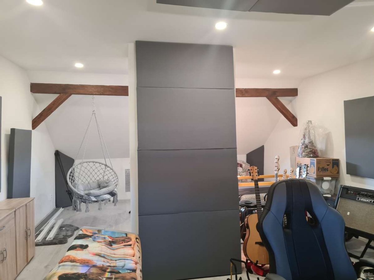 Thank you Soundman for analyzing the measurement and explaining the problems. It's an amateur studio, I don't need professional parameters. The room has its limitations, it will be used only for home recording, mixing. In the untreated back part of the room (behind the chimney) I wanted to install pyramid or barrel diffusers on the sloping walls, or on the back part of the chimney. Now I doubt it will probably not change the fundamental problems of the room and I should focus on the part of the room monitors-chimney. I still have 5 panels of mineral wool 50 mm and one panel hr 100 mm. I put the panels behind the monitors, but I didn't notice any difference in the measurement. Maybe it would help to put a 10 cm panel on the chimney at head height, monitors? I've already thrown away the big table. I'm going on vacation tomorrow, but when I come back I'll try various changes and measurements. If you still have tips on what to focus on and where to try to place the remaining panels or diffusers, I will be happy. The table is symmetrical (arched in front), did you mean the keyboard under the Pink Floyd flag?
