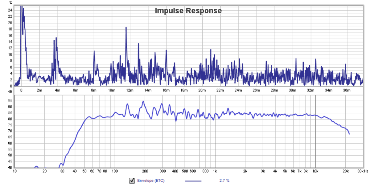 One other thing: There's a better way to look at impulse graphs when you are doing my string trick: That's from one of your MDATS, for the left speaker. To get that, go to the "impulse" tab, set the graph Y-axis units to "%" instead of "dBFS", zoom in so you get only about 0 to 25% on Y axis, and whatever you need on X-axis (usually around 30ms is fine), and Bob's your uncle! That makes it easier to see individual reflections.