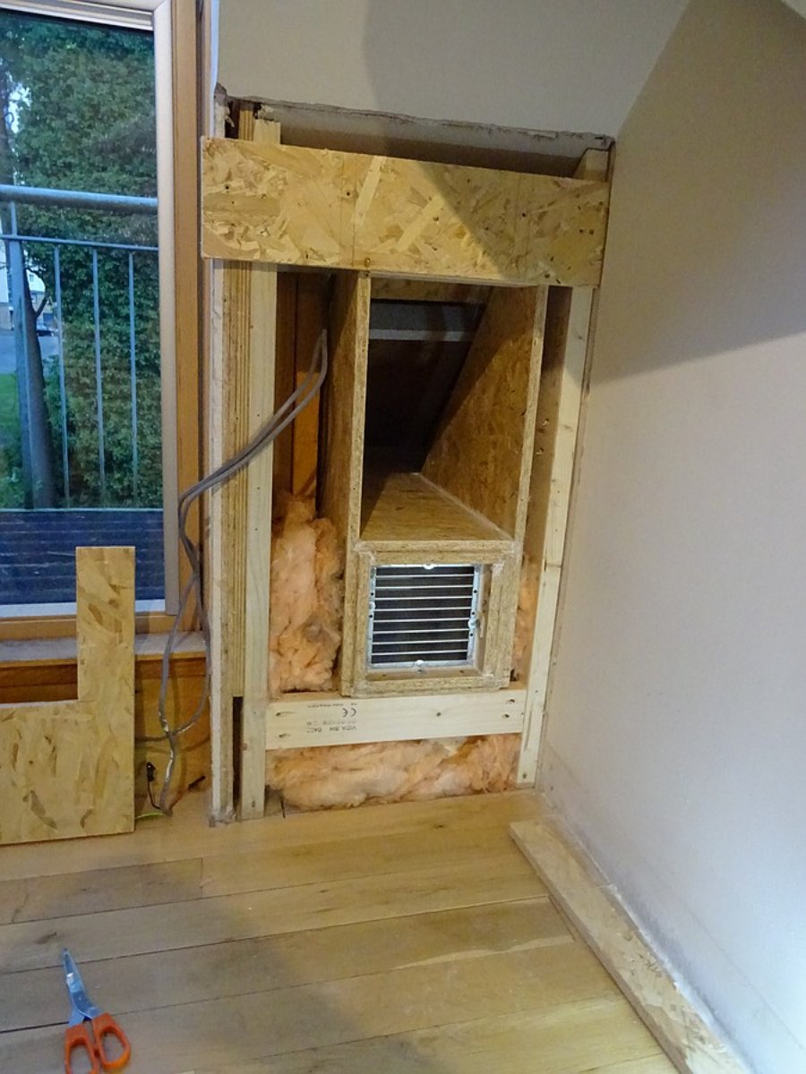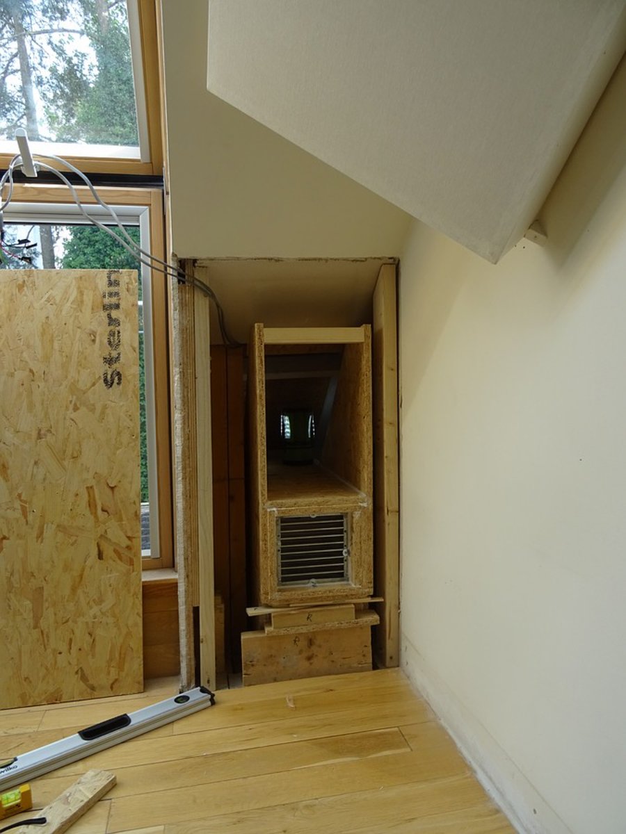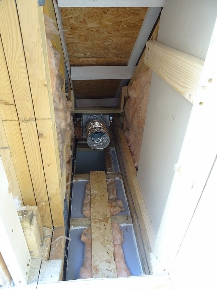 The silencer is screwed into a noggin under the outlet to support it. A temporary OSB support is at the top to hold the position while this is being done.