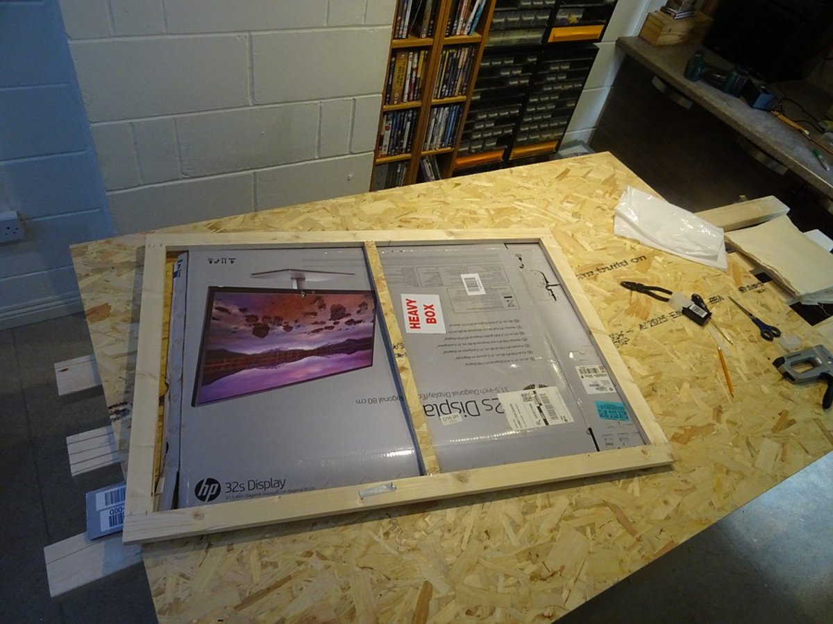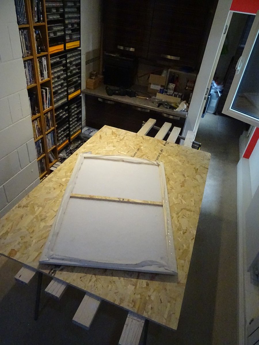 First layer of the wall, 18mm OSB, ready to fit. This is the top half. I did it in two halves, one above the vent, the other round and under it.
