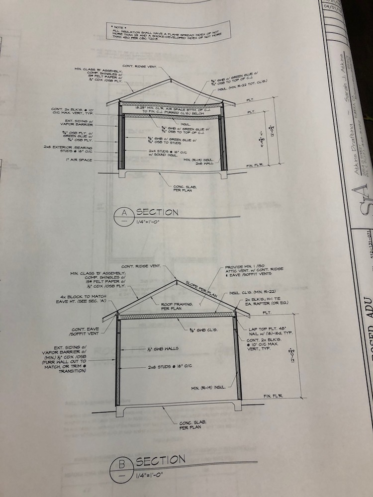 I started my research into acoustics and studio building in April of 2017 with a goal of September 2018 to complete the building. Work and family business forced me to take some breaks from researching. In March of 2018 I began again in earnest. Stuart set me straight about not guessing about anything and doing the math and relying on tested information instead of conjecture. With his help and other forum contributors, I worked and reworked my plan. I started working with sketchup but didn't get too far. So I hired a draftsperson to draw up plans to submit to the building department. Original plan was a 25'x18'x11'-2" one room studio with a separate 6x18x12' room with a bathroom, a kitchen sink, and "storage" which would be set up for a small refrigerator and stove after completion. Studio portion would be a Room within a room double-stud wall construction with 3/4" OSB and 5/8 drywall on inside and two sheets of 3/4 OSB on outside with Green Glue in between and a 1" gap all around on a concrete foundation. The roof had to be vented, so the middle leaf would be the "real" outer ceiling and the inner leaf would be the studio inside-out ceiling. I would use a vented mini split for heating/cooling.