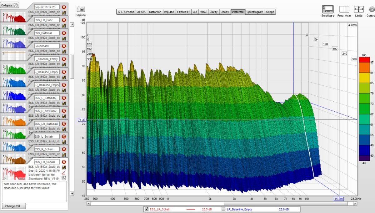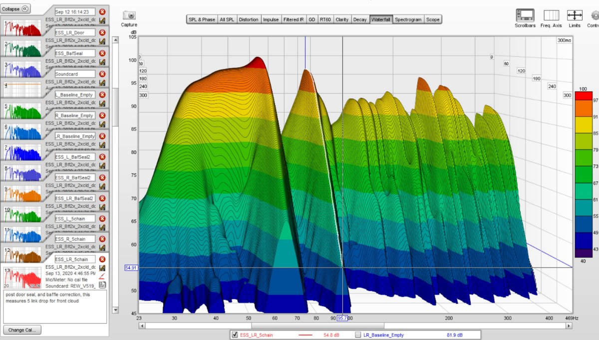 I'm starting to get a bit nervous on my measurements. It seems i'm either getting some significant modes or comb filtering looking at my waterfall plots. The significant caviot is that i still don't have the door installed, but I will remedy that this week. (the doors have arrived and are mostly done, I just need to install the door bottom. I will re-test after the door.