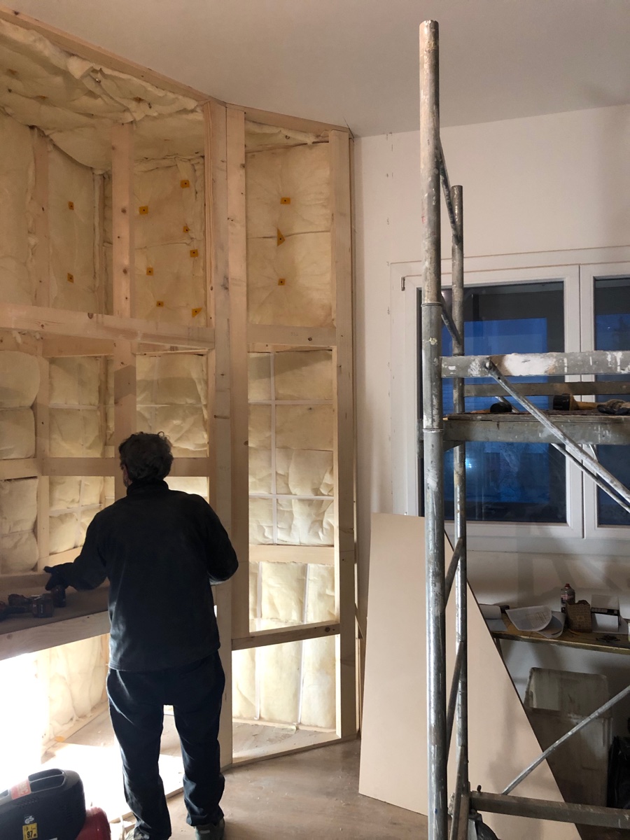 Now we are completing the rounded parts of the back treatment with vertical slats, we have built frames that are individually covered with the black fabric.