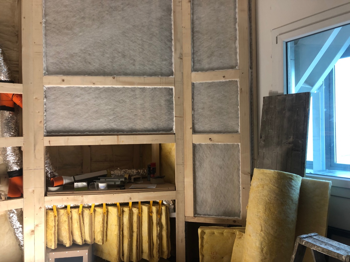 Guys .... it was really a hard job even if you don't perceive much from the pictures, especially to make and assemble the "hangers" made with a 12mm chipboard core and 30mm fiberglass on each side with a density of 20kg / mc, I don't remember the flow resistance but I think about 10000. The heaviest panels are over 40kg, consider that the height of the room is 3.48mt.