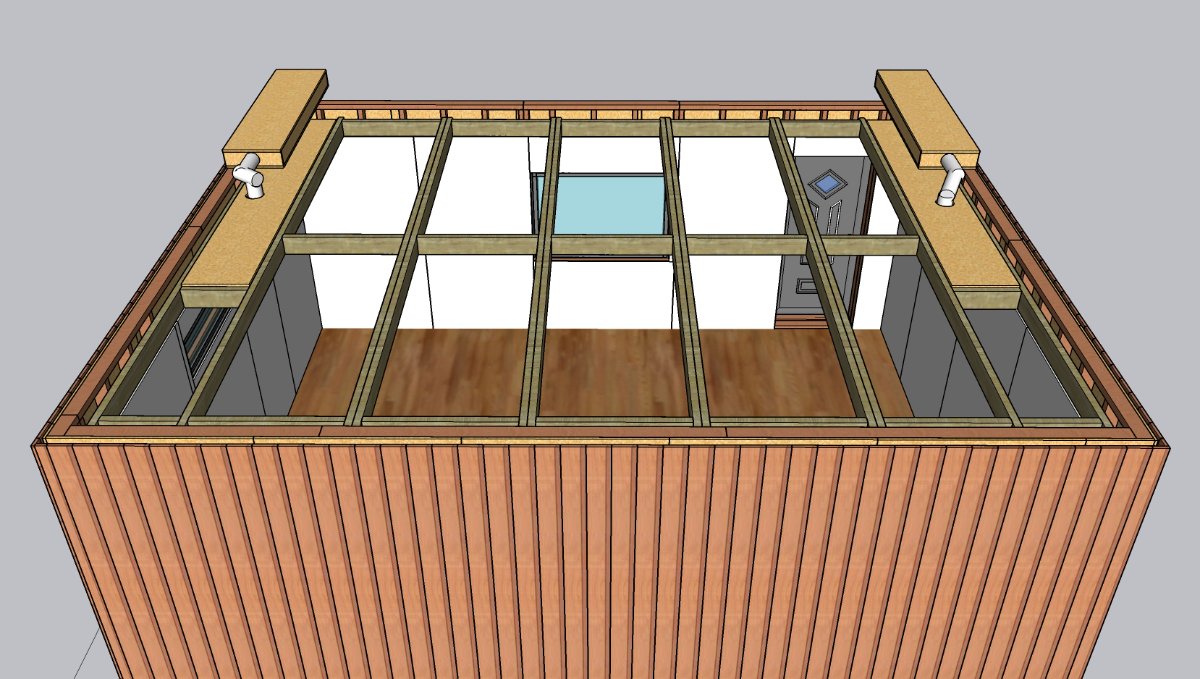 After some calculations, I have decided to go with the warm roof and have the ventilation boxes inside the gaps of internal and external roofs, as Gareth has also done. I will copy the brilliant design of Stuart's silent vent boxes.