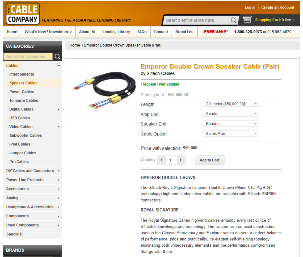 Yes, that's correct: It is not a typo. You can actually get these absolutely amazing 6-foot long speaker wires for just fifty THOUSAND dollars a pair! Unbelievable as that may seem, it is TRUE! You can get your very own pair (right after you get a second mortgage, sell your car, and max out your credit card), here: