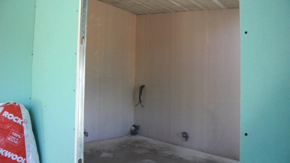 Paul arrived first at 8:40 and we discussed the new bill 680€ (for the labour for the inside wall building) and what will happen this week. They will not pour the floor until tomorrow in the live room and will focus on the 2nd layer of plaster board for the walls. They will not do the roof this week so if it still looks like possible rain on Saturday, we will have to cover the roof with plastic again. Progress is slow..