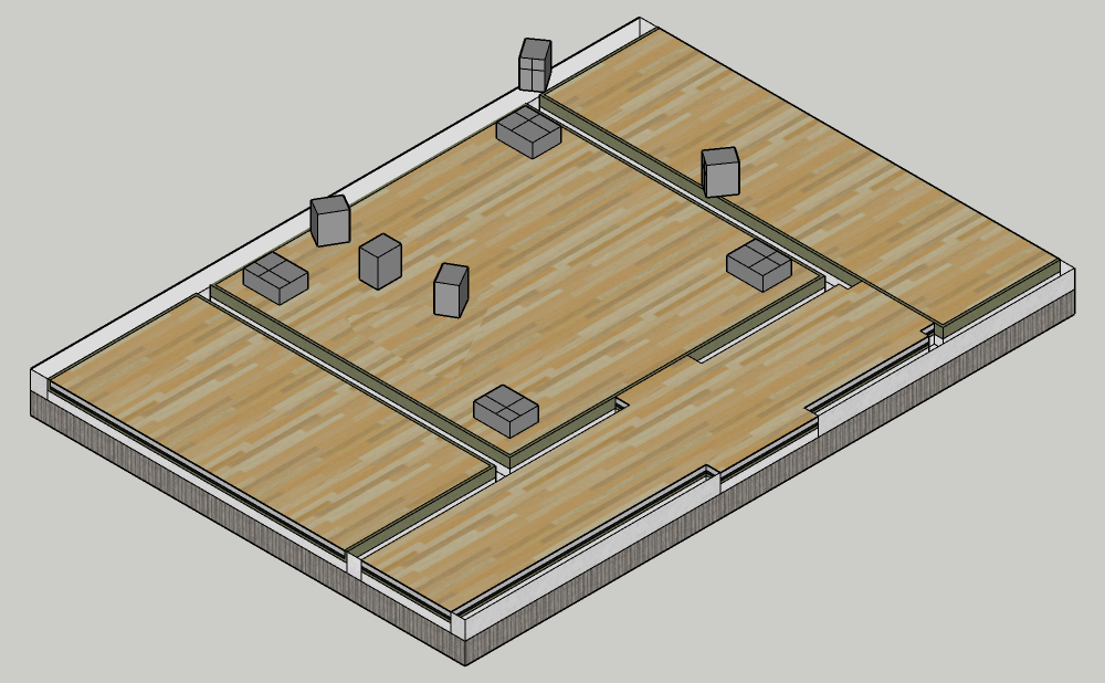 ! The front baffle will be bigger again, and the Lr and Rr won’t even have a baffle, just false walls around them, so the reflective surface is only the speaker itself. The baffle around the L, C and R speakers are enlarged again to the whole front, but there is space underneath and above for the Hangers to work properly and for the speaker ventilation. Underneath I have a 32cm slot, and above a 42cm slot. Also, with the new framework introduced in my last post, there is a false wall for the bass hanger. I hope this will be okay and the bass hangers will work. Here, I would like to have some feedback.