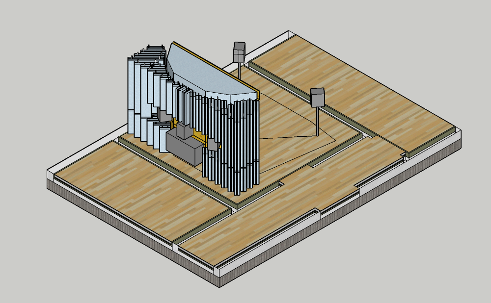 The cloud will be 19,5 cm thick and cover the whole remaining ceiling between the flush mounting baffle and the false wall. I plan to put the in- and output of the HVAC behind it, If possible, so that fresh air will be pushed into the room on the rear part of the cloud, and will be sucked out of the room in the front part of the room. I will install some air flow guides, too, so that the fresh air does not only circulate behind the cloud, but through the room. The HVAC will be located on the roof of the building, including the silencers and heat exchanger.