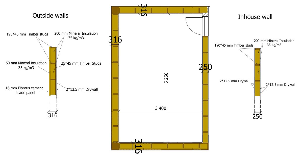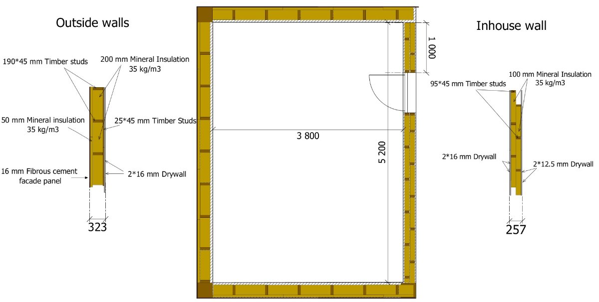 In general, the dimensions of the entire room are 5.25x3.40x2.75. Concrete floor with built-in water heating. There will be no other rooms above the room, but there will be a flat, exploited roof, where we will sometimes gather with our family. The structure of the ceiling will consist of 400 mm I-beams filled with mineral insulation with a density of 35 kg / m3, on top of which there will be an operating roof covering with decking. From the inside, the ceiling is sheathed with two layers of 12.5 mm drywall. In principle, nothing bothers me here, but I would like to ask how critical it is for sound insulation that one wall is slightly different in structure and width from the other three? This wall is not adjacent to living and noisy rooms, so maybe this is not a problem? Also at this stage, I can replace the inner wall cladding with a thicker drywall or other material if this helps to slightly improve the sound insulation.