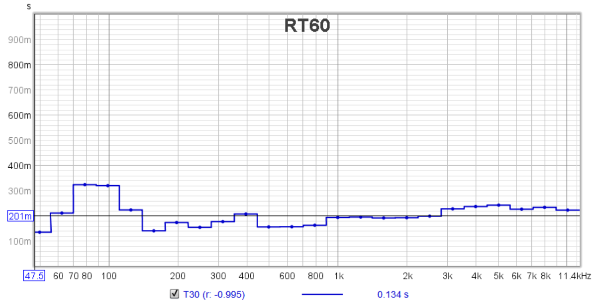 We only have the left speaker connected at the moment. I also assume they are also from the mix position.My first impression is that the smoothing on the graphs is rather extreme, and possibly hiding important details. using 1 octave band smoothing on the RT (decay) graphs tells you very little at all, and the international specs commonly used for control rooms (such as EBU-Tech.3276 and ITU-BS.1116-3) call for measurements to be done at one-third octave resolution, with no more than +/- 50ms variation between adjacent bands. I'd suggest that you ask him to show that graph at the "standard" resolution, so you can see how the room is really performing, as compared to the specs. Here's what a typical RT graph should look like. This is for a room a little smaller than yours, shown at the normal spec resolution (1/3 octave smoothing): SNOLO--REW-RT60--50hz-12khz-FINAL--1..3+cursor200ms.pngHere are the results.