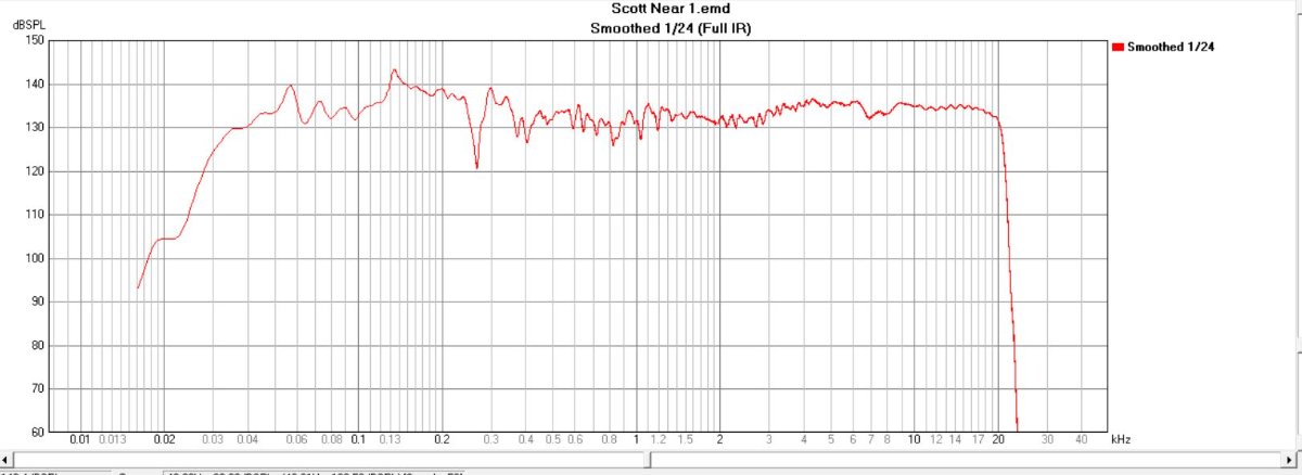 "If that's the case (which is, indeed, the "standard" level for doing such measurements), then why do the graphs show levels about 10,000 times higher, at around 120 dB? In fact, both the Frequency Response and waterfall graphs show some peaks approaching 130 dB! Did he not calibrate the system, to show the real SPL levels? It isn't necessary to calibrate if you just want to compare relative levels, true, but for looking at absolute levels it is necessary..."