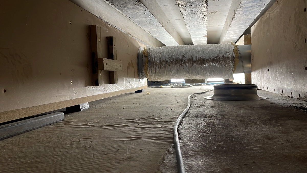 The silencers are in on Sorbothane, all connected up with 8” duct in the ceiling void which then got 300mm minimum of fibreglass loft insulation, this was hideous to do!