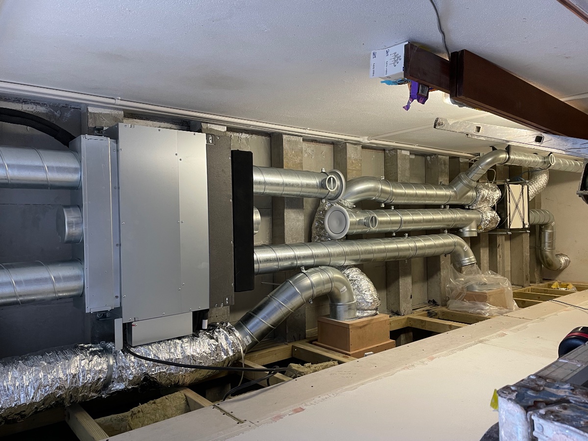 Heat recovery unit installed and all ducted up including cored holes in the outside walls. Flexi duct used at some point on all runs to isolate the vibrations from the fan units.