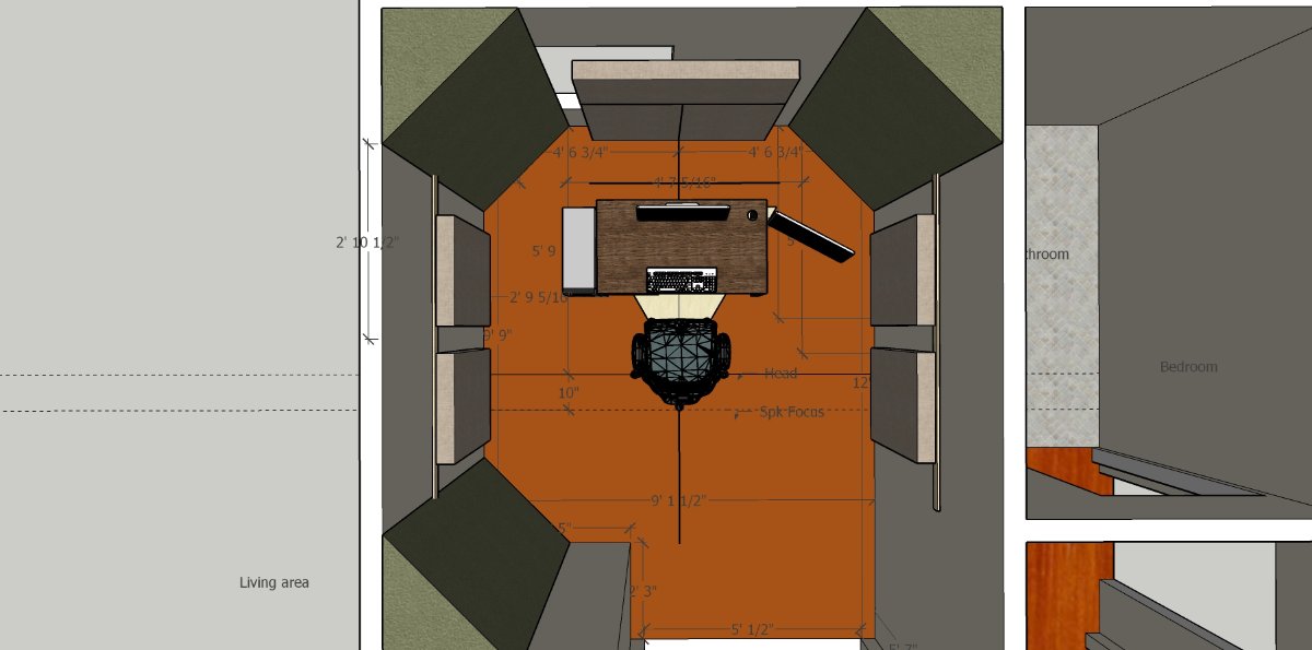 It is a small room, roughly 9'x12' with 9' ceiling. There will be no attempt at sound-proofing, as I live alone, and if I have overnite visitors, I have been working in ... need I say .... HEADPHONES. Yep ... something that I once despised ! Mainly because absolutely nothing I did in them would translate to anything in the rest of the world ... it was just horrible.