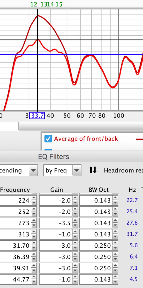 The REW EQ settings pane is really interesting.. sat on the sofa rather than in the studio I've played with filter settings compared with the front/back average measurement(s). I started with the room modes as identified by the Bob Golds calculator: