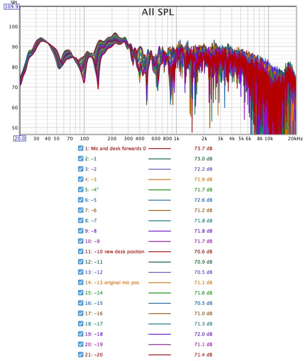 Having put the desk back, I then moved the desk and mic quite far forward towards the speakers, and started working backwards, moving the desk and mic around 1" at a time. As the purpose was not to find the best position for the desk I didn't measure this perfectly.