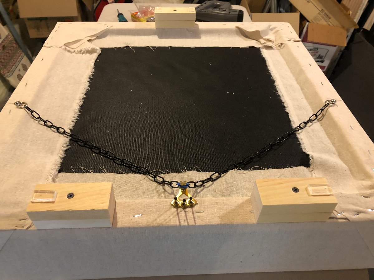 I'm still working out the best distance from the top to mount the chain and connections ... looks to be 12" down from the top, with a 6" loop to make it easy to draw it outward to hang on a picture hook. [the wood added some weight ... but still not bad].