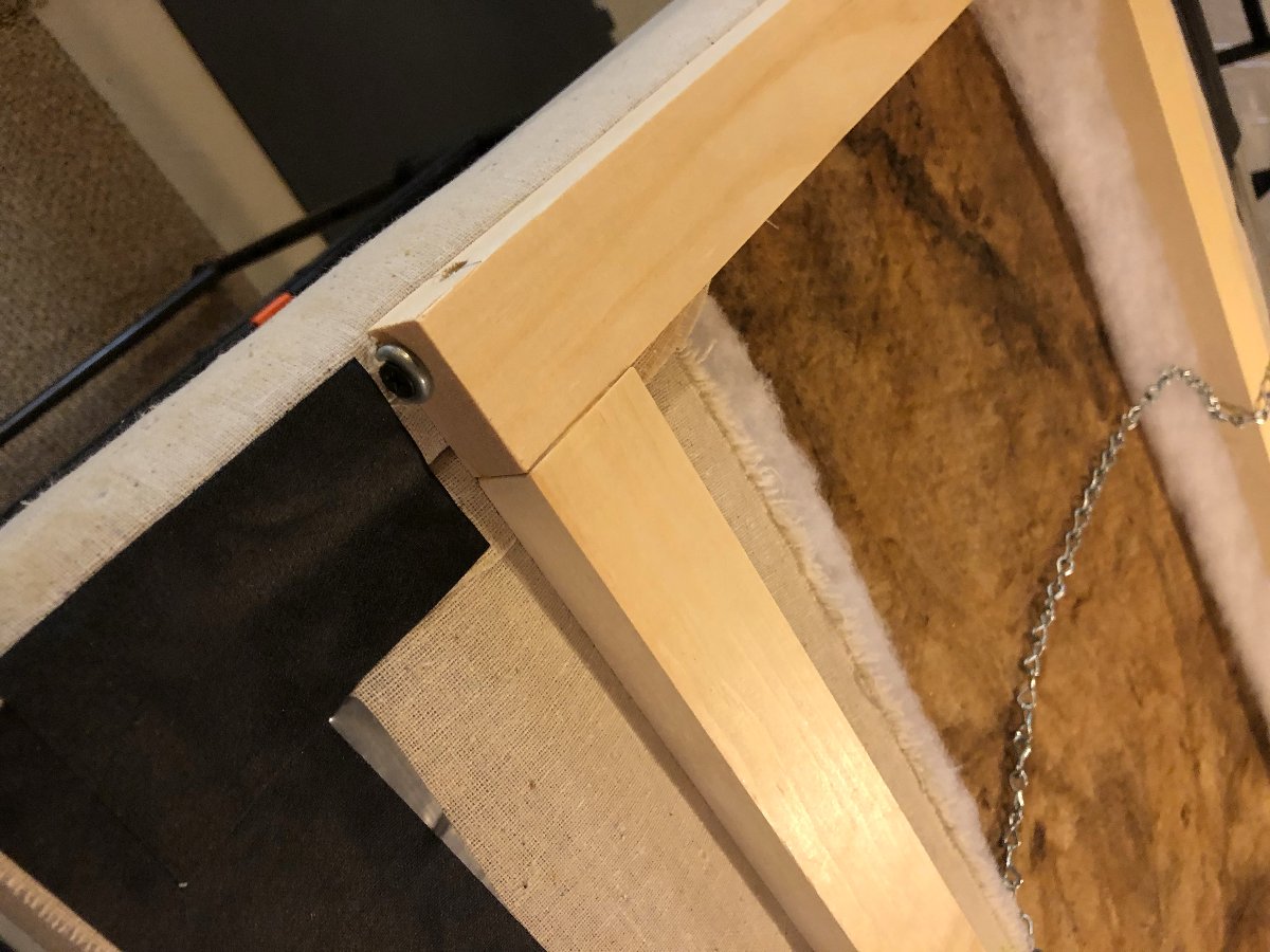 Because the back of the panel would be exposed [to the wall], I used that 'landscaping fabric' to cover the inside back [prevent any fiber escape], and still allow me access to the back frame for stapling and installing chain and wall standoffs.