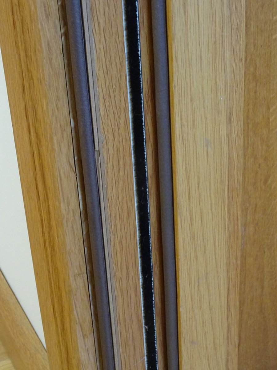 No "bank vault" overlap of the new face was possible along the hinge edge, but the compression between the door edge and frame here will be very high and allow multiple good seals anyway.