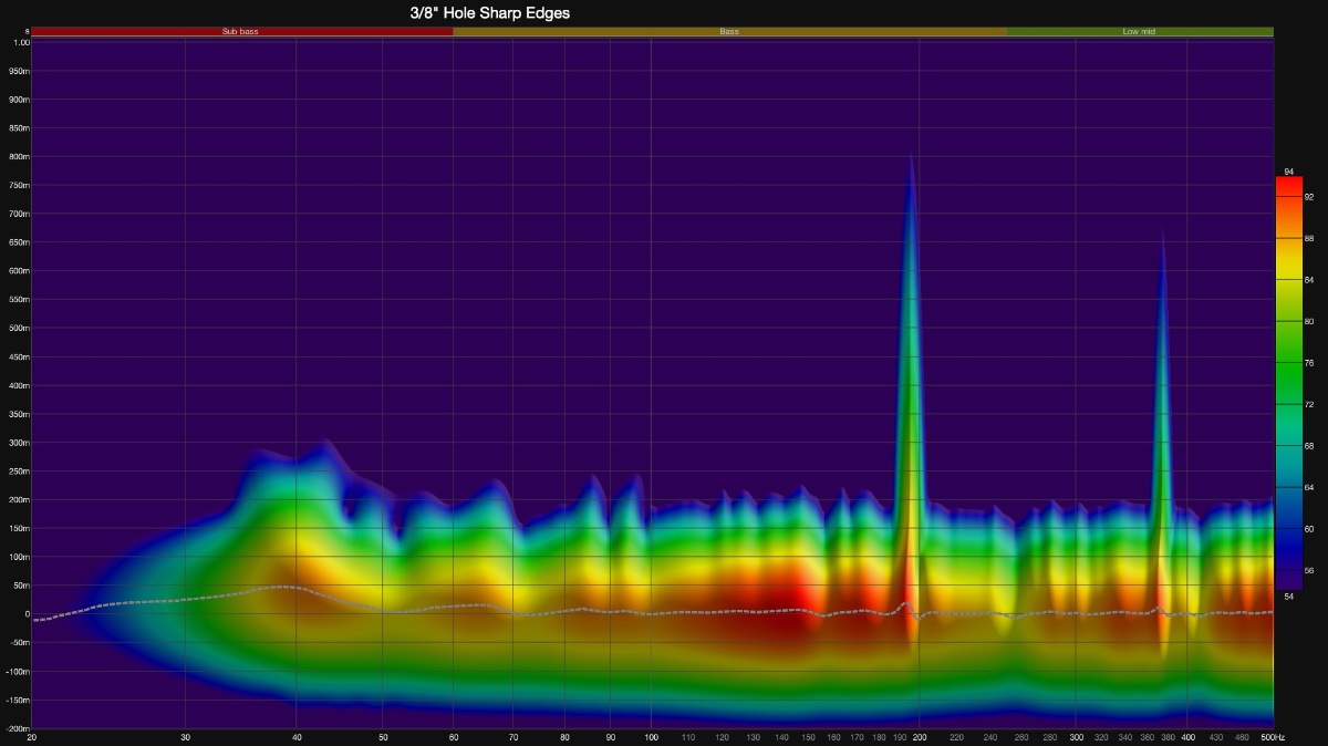 Here is the spectrogram for the same 3/8" hole with chamfered edges. There is now a long decay tail around 44Hz, indicating a narrow band resonance: