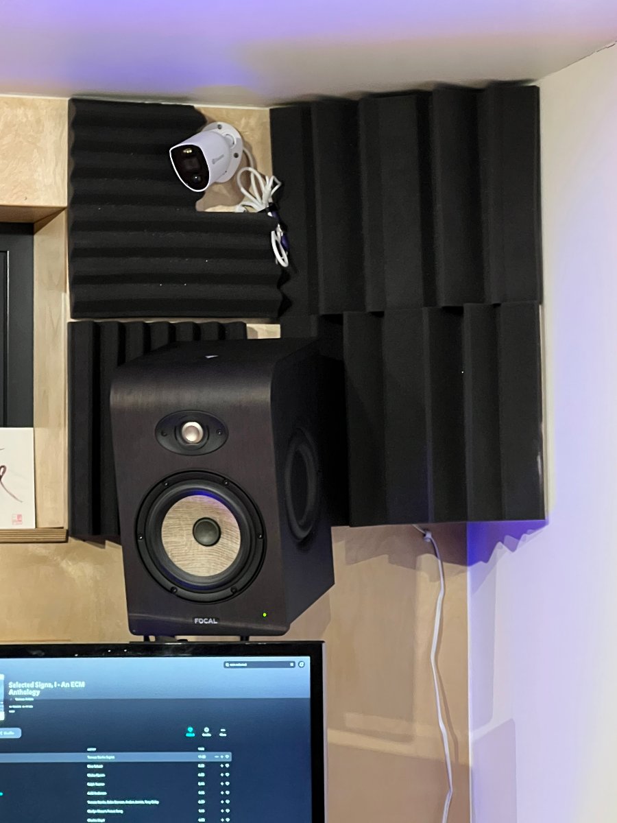 Treatment-wise, I have fitted bass traps on this end wall and will fit foam panels on the wall deirectly behind the monitors, once they are wall-mounted, and on their reflection point on the ceiling.