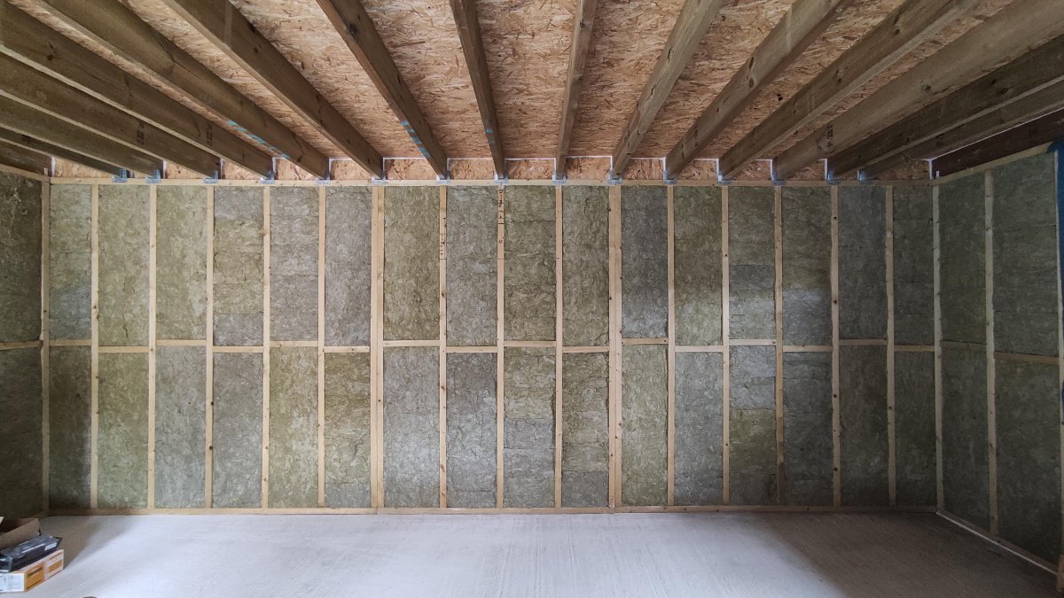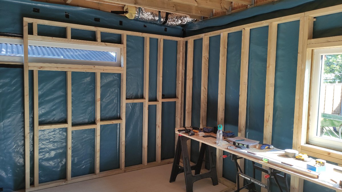 Realised I didn’t post a pic of the internal stud walls once insulated with the fluffy stuff, so here it is just prior to installing the moisture barrier.
