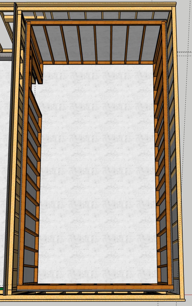 • The space is a long and narrow rectangle, so I went with inside out walls on the sides to maximize the room width. Air gap between these walls is 6.5”. Ceiling is also inside out, however the two short walls are built standard as I have plenty of room length. Gap between those walls and also the ceiling leaves is ~10”. (initial MSM calculations were done with the 6.5” gap).