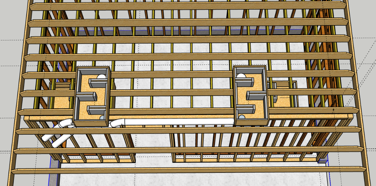 Here’s an rough model I made with just two larger boxes, just so I could see what sort of space logistics I’m dealing with. I have a 16”OC joist grid where I can drop the duct into the room (14.5” square area). I still need to model the four-box version, to see if hanging two inside the room is even feasible.