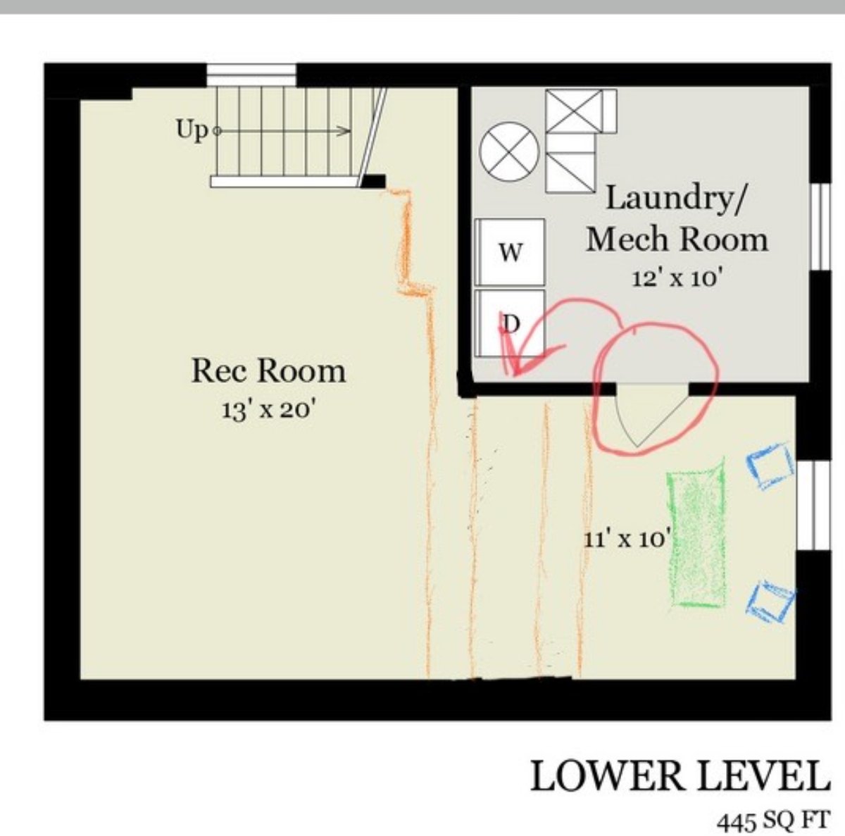I've also attached a rough mockup of the floor plan and general setup. The orange lines represent the bump outs on the ceiling. Blue is speakers. Green is desk. (Nothing to exact scale). The laundry room door can be moved as indicated with the red arrow so that I can treat the side wall.